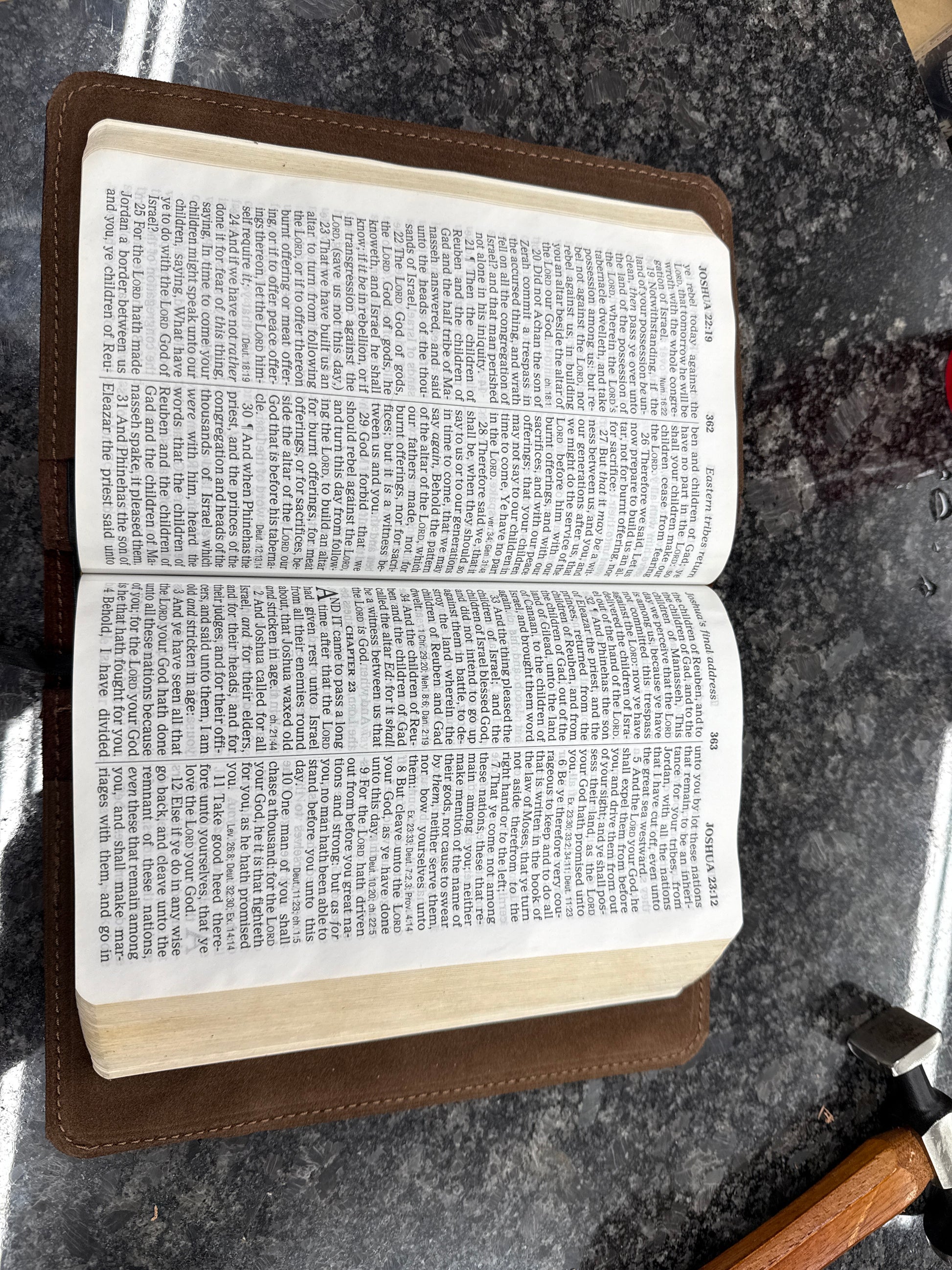 This is a beautiful bison leather with a hand carved picture of praying hands. The inside pockets are suede to hold the good book in place. This cover holds a bible that is 9 inches tall, 6 inches wide and 2 inches thick. Would you like a custom made cover for your bible? Contact us let us make it for you.