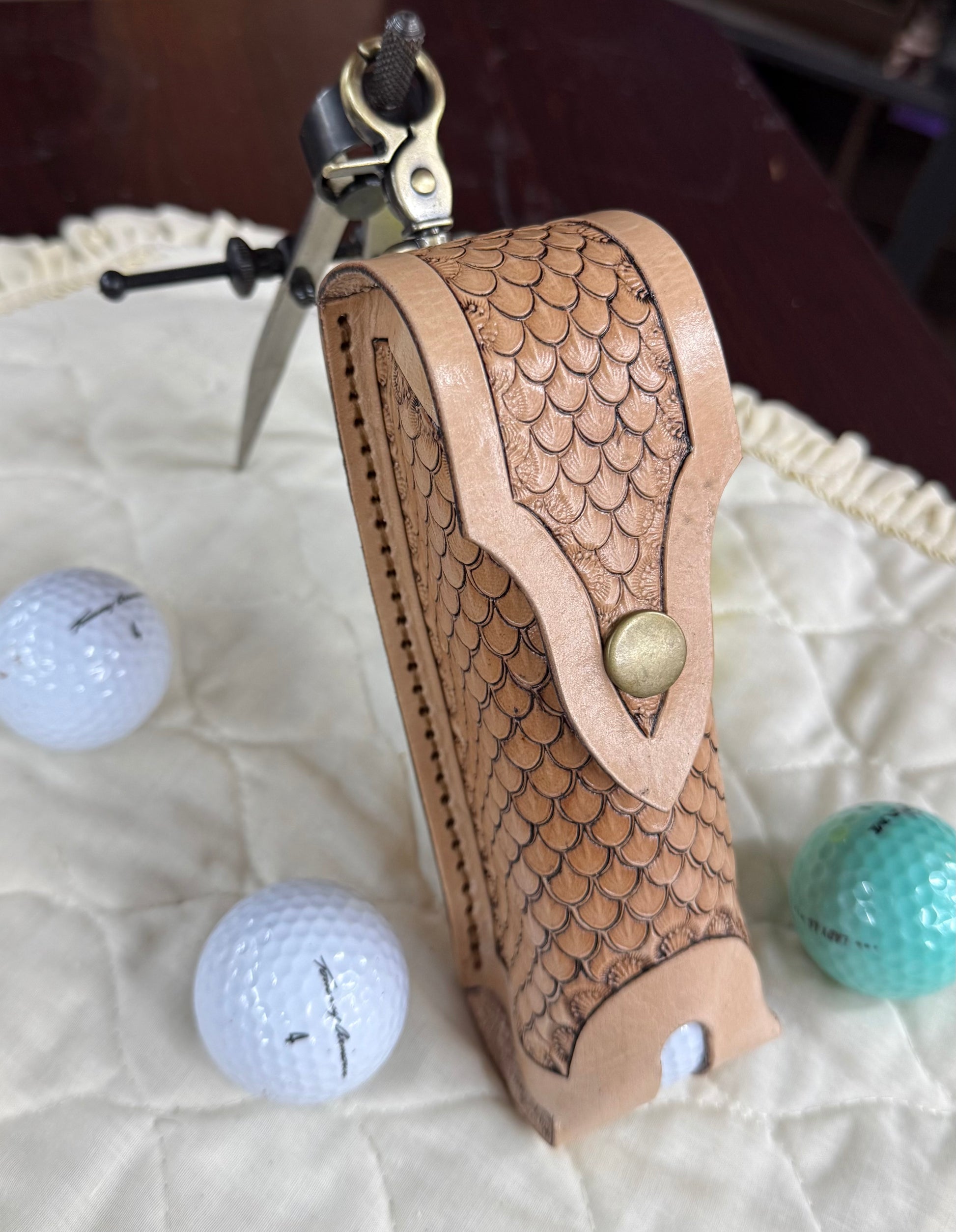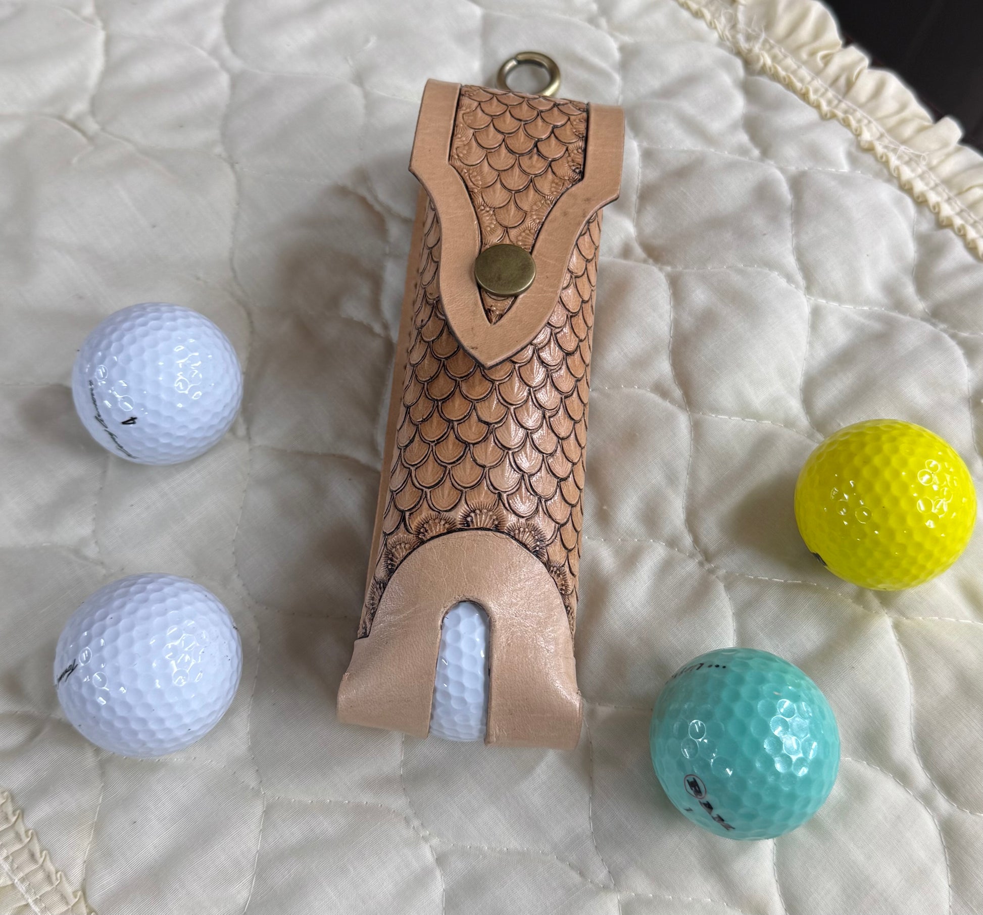 This golf ball sleeve is hand stamped with a dragon scale pattern. it holds 4 golf balls that can be squeezed out of the bottom of the pouch. Unsnap the top to fill it back up. the hardware completes it with an antique brass swivel snap for conveniently attaching the sleeve to your golf bag.